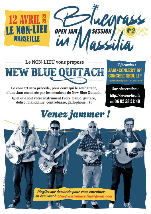 Le groupe New Blue Quitach est l’un des pionniers du bluegrass en France. Issu de la deuxième génération de groupes français, il incarne un équilibre entre tradition et modernité. Attaché au son acoustique traditionnel du bluegrass, le groupe met à l’honneur les harmonies à quatre voix, tout en intégrant des influences diverses comme la musique irlandaise, le rock et le blues. Son originalité réside dans des adaptations uniques de chansons françaises et des compositions instrumentales reflétant cette diversité. Dynamiques et professionnels, Ils séduisent aussi bien les amateurs de bluegrass que le public en découverte musicale.